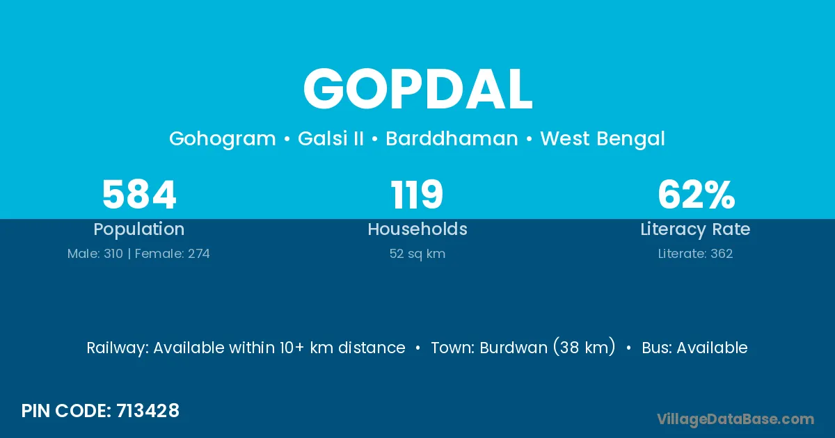 Burdwan (38 km) is the nearest town to Gopdal village for major economic activities and is located approximately 38 km away.
