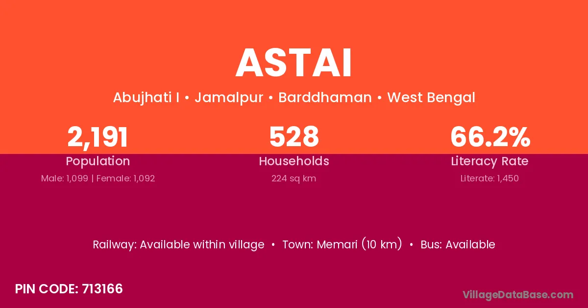Memari (10 km) is the nearest town to Astai village for major economic activities and is located approximately 10 km away.