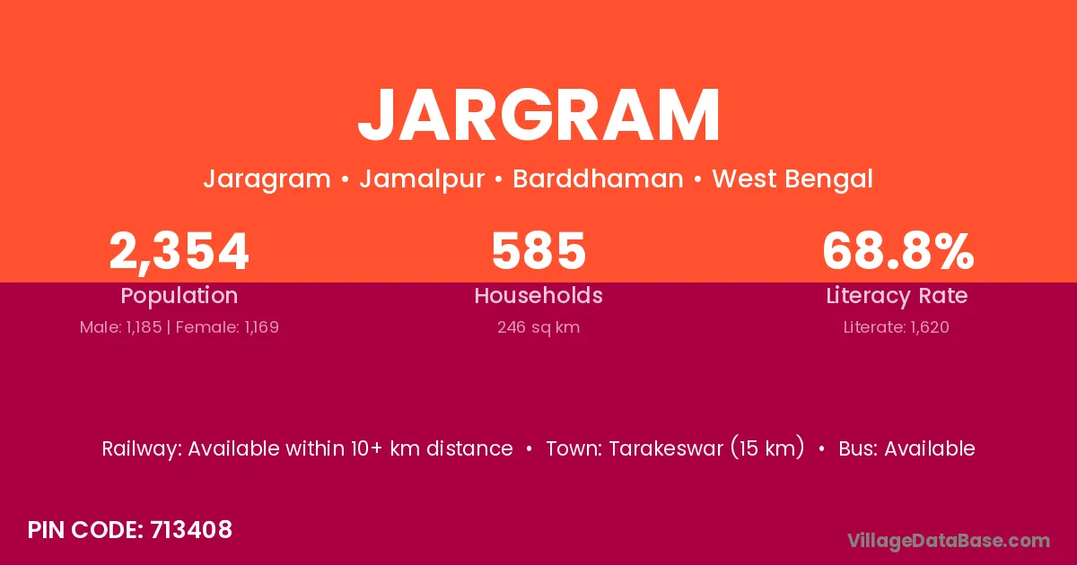 Tarakeswar (15 km) is the nearest town to Jargram village for major economic activities and is located approximately 15 km away.