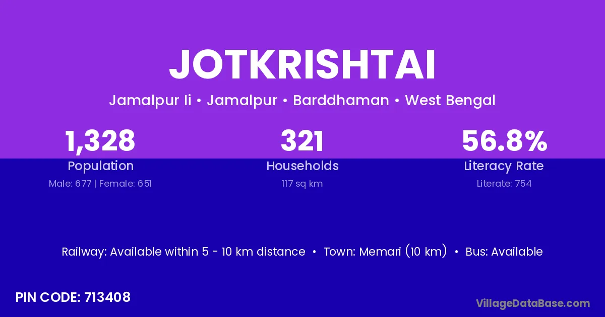 Memari (10 km) is the nearest town to Jotkrishtai village for major economic activities and is located approximately 10 km away.