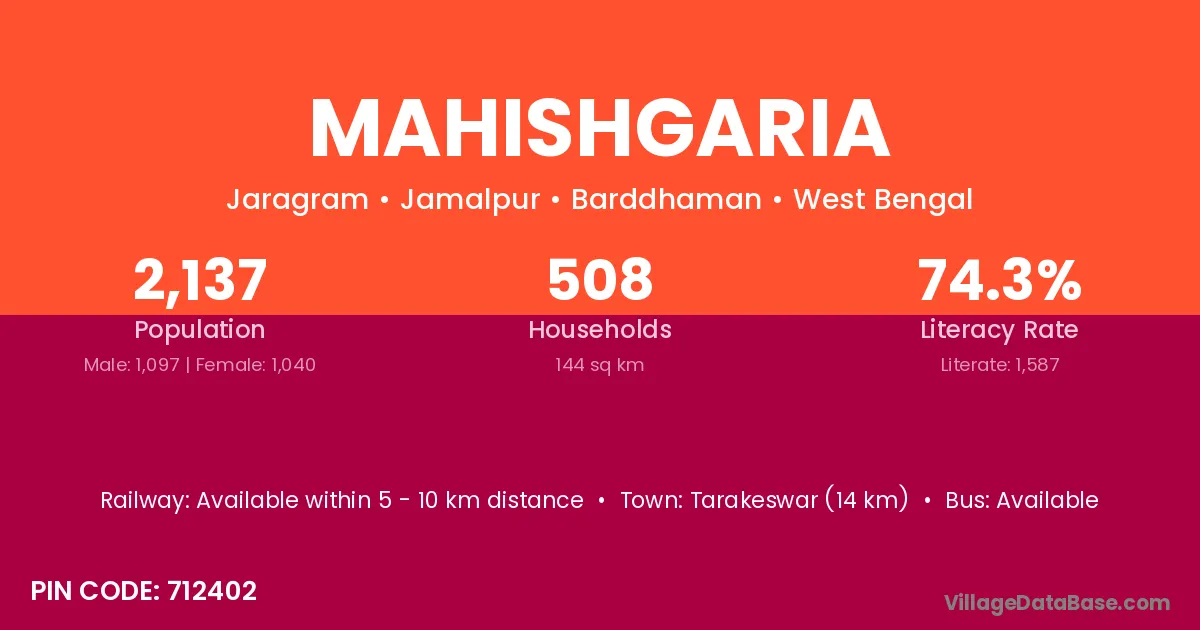 Tarakeswar (14 km) is the nearest town to Mahishgaria village for major economic activities and is located approximately 14 km away.
