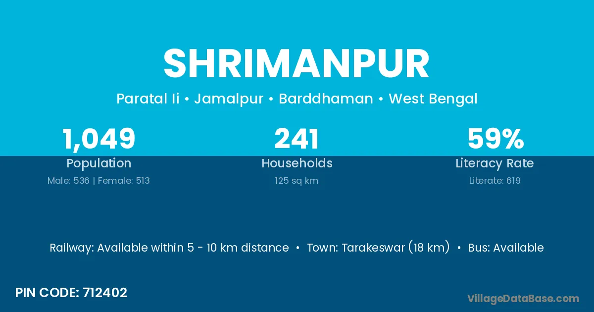 Tarakeswar (18 km) is the nearest town to Shrimanpur village for major economic activities and is located approximately 18 km away.
