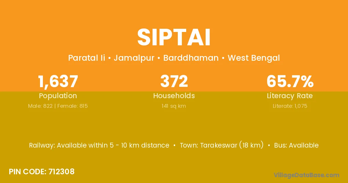 Tarakeswar (18 km) is the nearest town to Siptai village for major economic activities and is located approximately 18 km away.