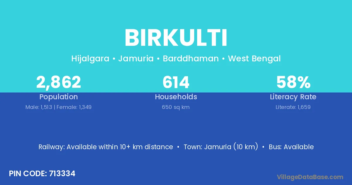 Jamuria (10 km) is the nearest town to Birkulti village for major economic activities and is located approximately 10 km away.