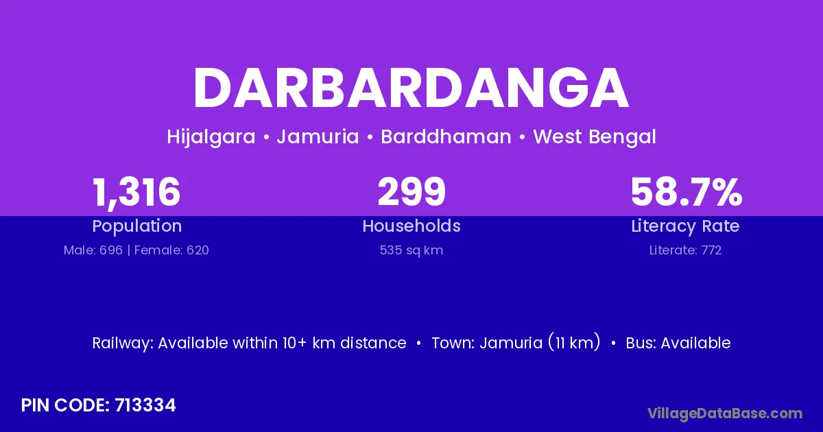 Jamuria (11 km) is the nearest town to Darbardanga village for major economic activities and is located approximately 11 km away.