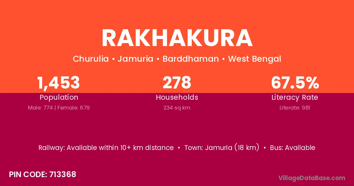 Jamuria (18 km) is the nearest town to Rakhakura village for major economic activities and is located approximately 18 km away.
