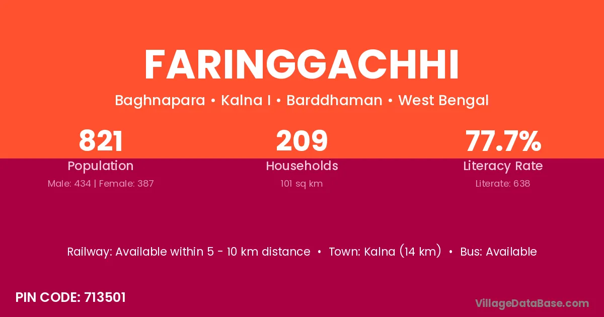 Kalna (14 km) is the nearest town to Faringgachhi village for major economic activities and is located approximately 14 km away.