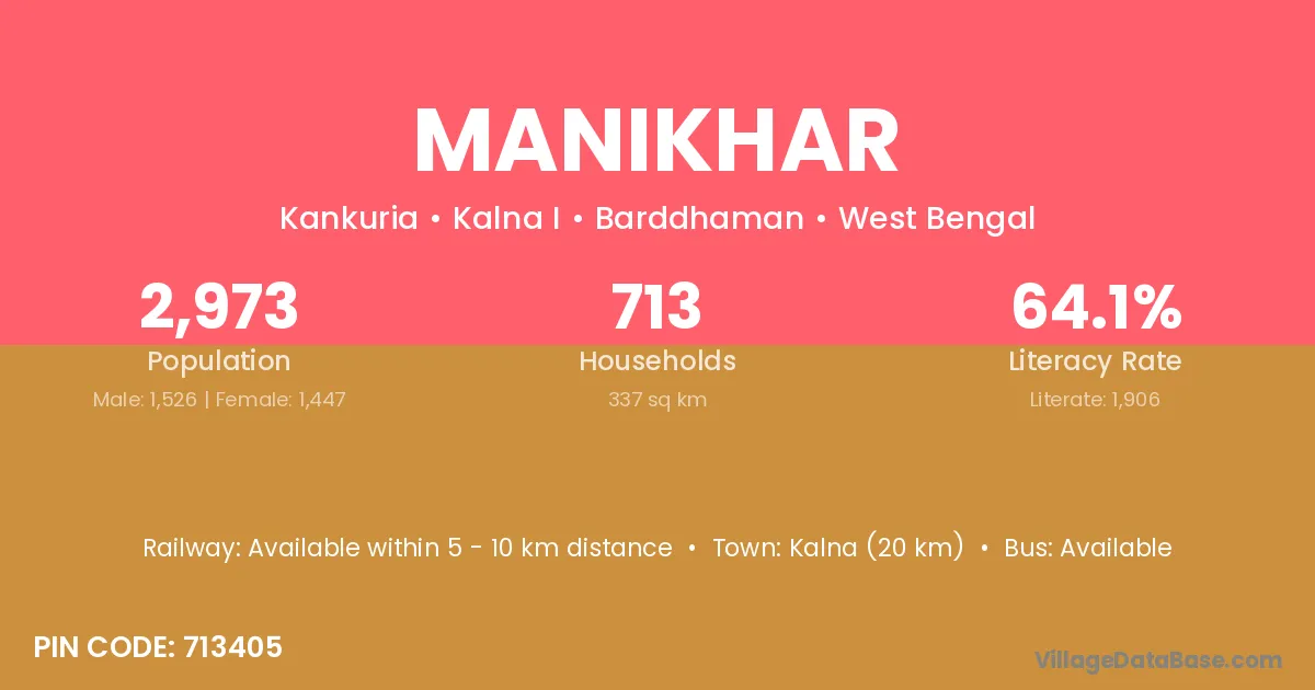 Kalna (20 km) is the nearest town to Manikhar village for major economic activities and is located approximately 20 km away.