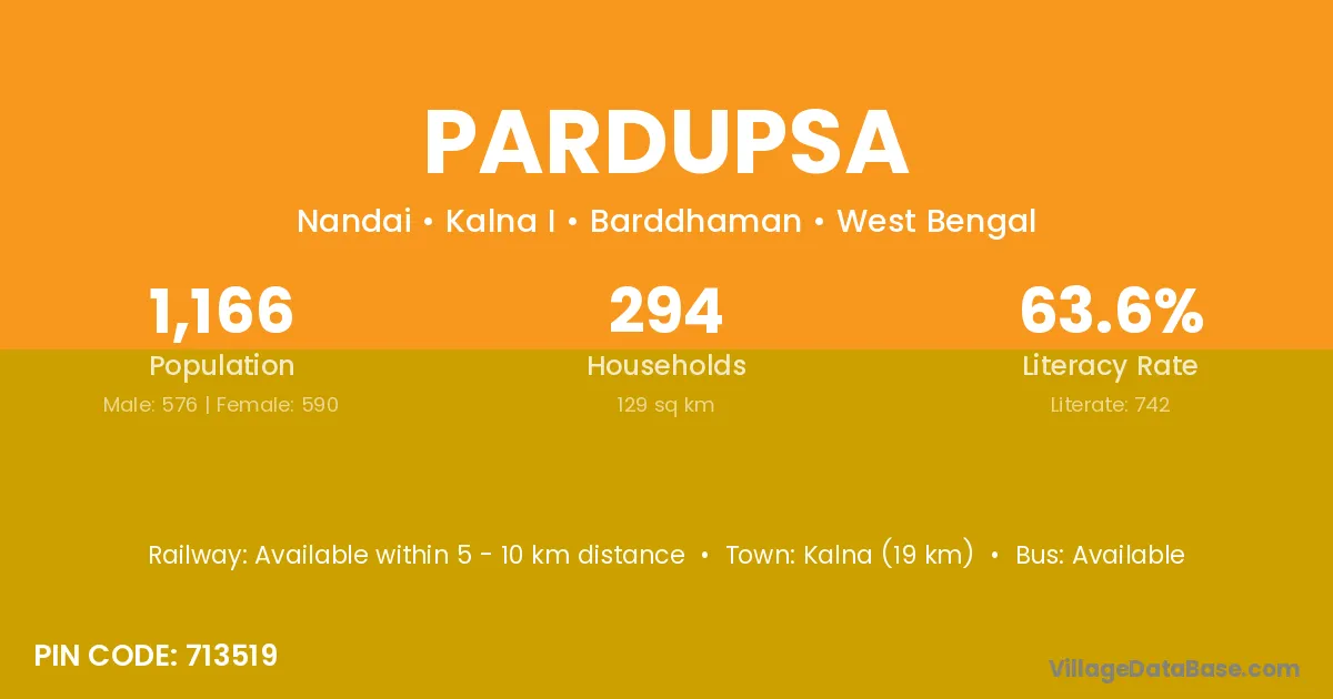 Kalna (19 km) is the nearest town to Pardupsa village for major economic activities and is located approximately 19 km away.