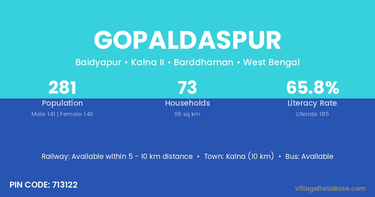 Kalna (10 km) is the nearest town to Gopaldaspur village for major economic activities and is located approximately 10 km away.