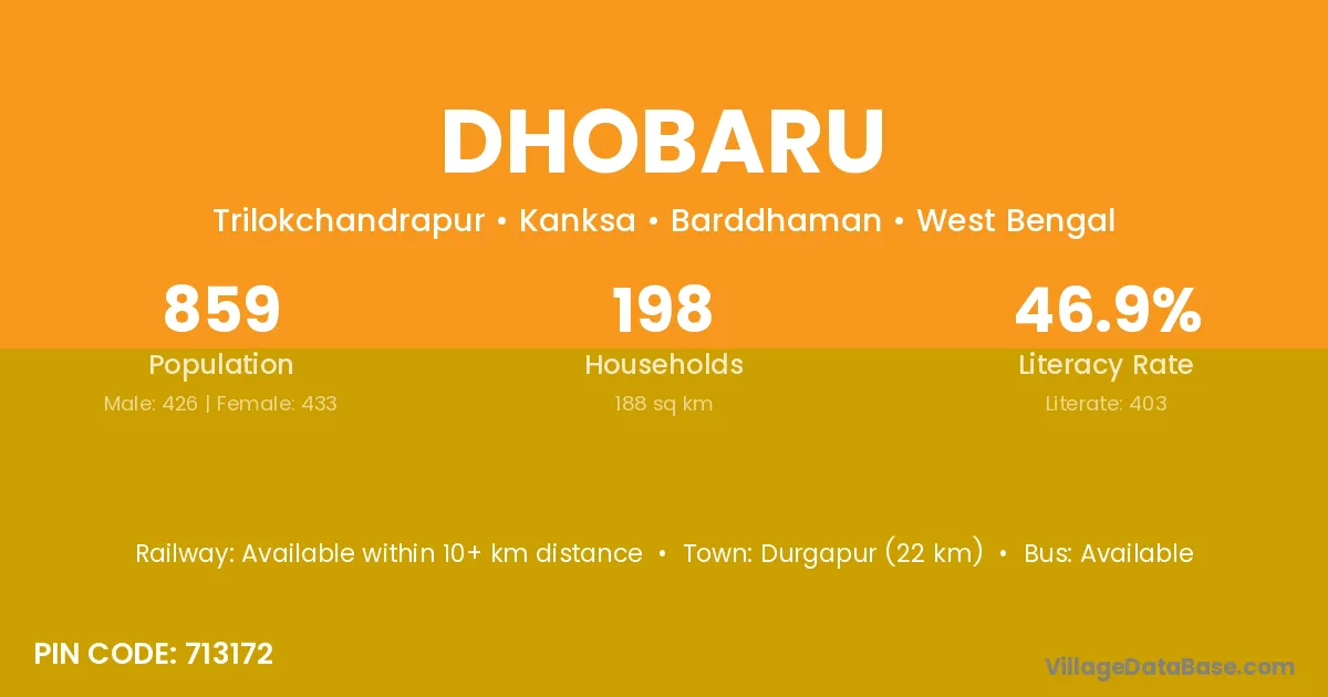 Durgapur (22 km) is the nearest town to Dhobaru village for major economic activities and is located approximately 22 km away.