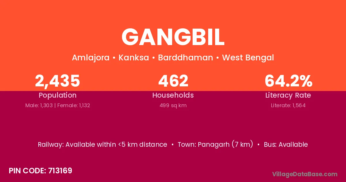 Panagarh (7 km) is the nearest town to Gangbil village for major economic activities and is located approximately 7 km away.