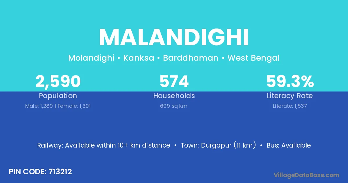 Durgapur (11 km) is the nearest town to Malandighi village for major economic activities and is located approximately 11 km away.