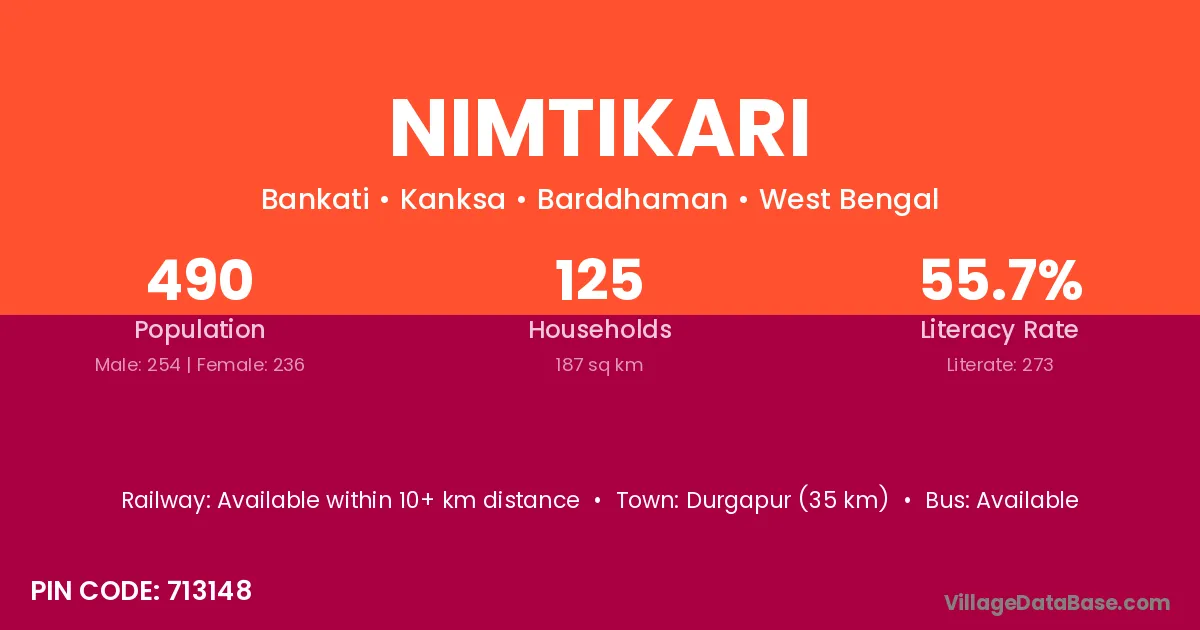 Durgapur (35 km) is the nearest town to Nimtikari village for major economic activities and is located approximately 35 km away.
