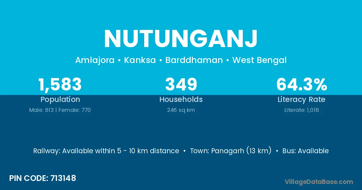 Panagarh (13 km) is the nearest town to Nutunganj village for major economic activities and is located approximately 13 km away.
