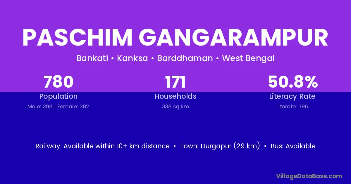 Paschim Gangarampur village has a total population of 780 people, of which 398 are males and 382 are females.