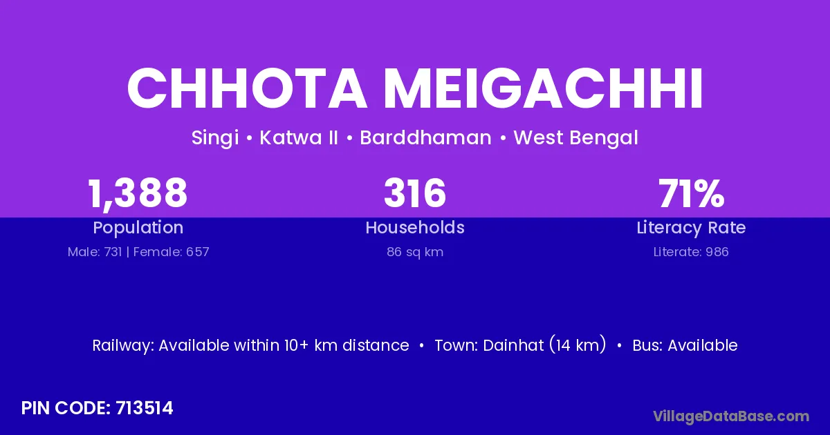 Chhota Meigachhi village has a total population of 1,388 people, of which 731 are males and 657 are females.