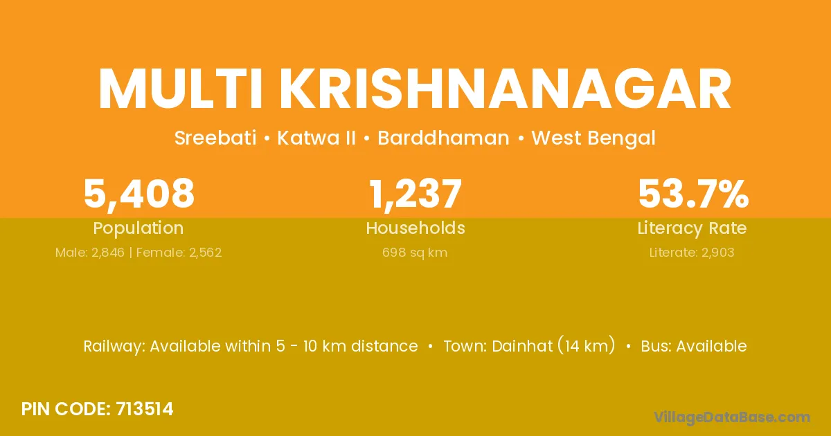 Dainhat (14 km) is the nearest town to Multi Krishnanagar village for major economic activities and is located approximately 14 km away.