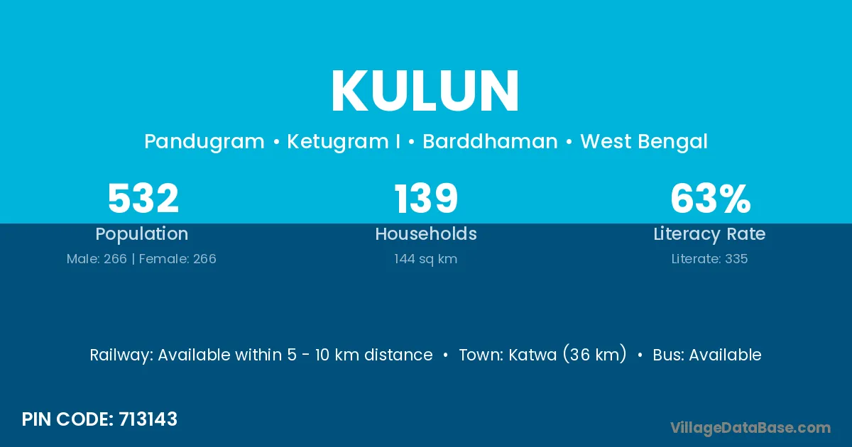 Katwa (36 km) is the nearest town to Kulun village for major economic activities and is located approximately 36 km away.