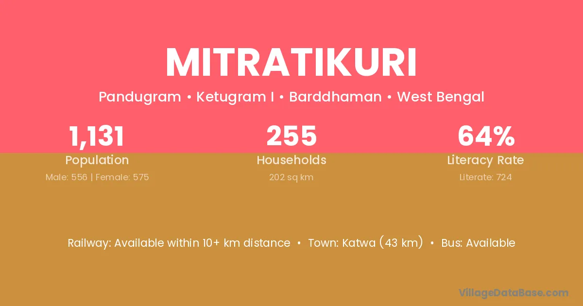 Katwa (43 km) is the nearest town to Mitratikuri village for major economic activities and is located approximately 43 km away.