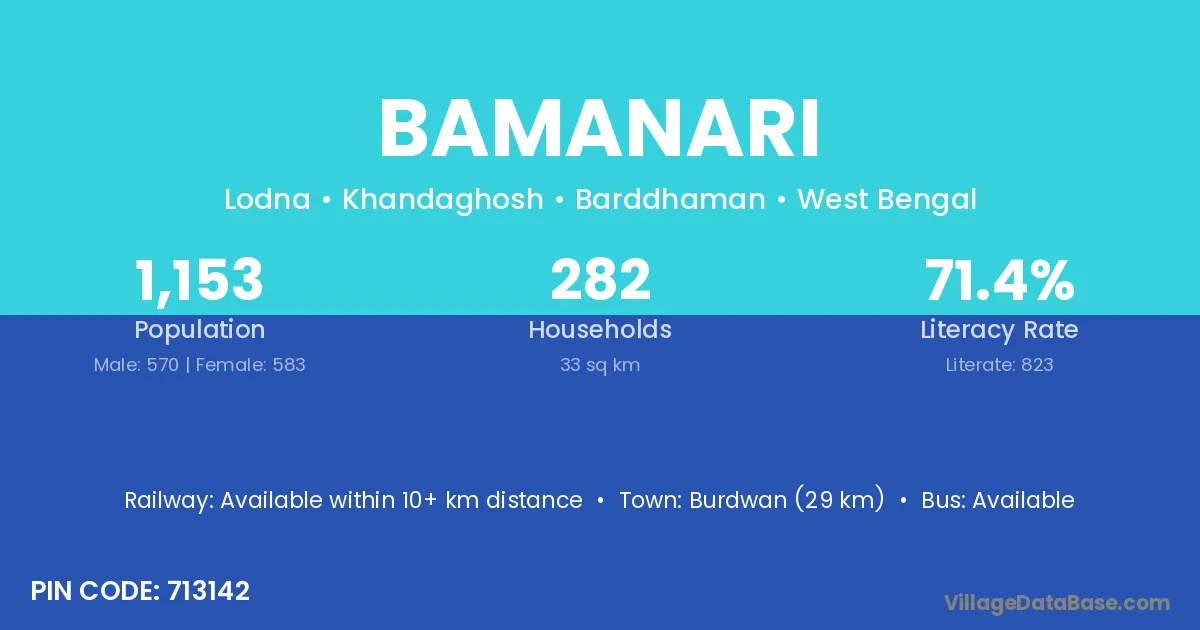 Burdwan (29 km) is the nearest town to Bamanari village for major economic activities and is located approximately 29 km away.