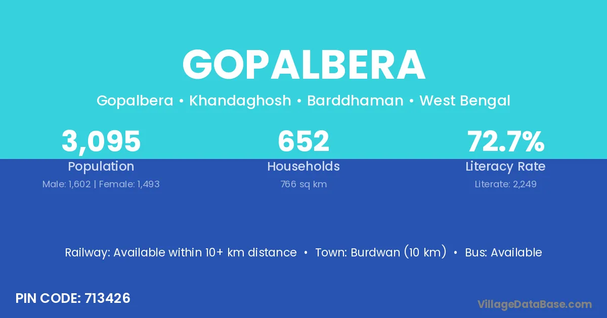Burdwan (10 km) is the nearest town to Gopalbera village for major economic activities and is located approximately 10 km away.