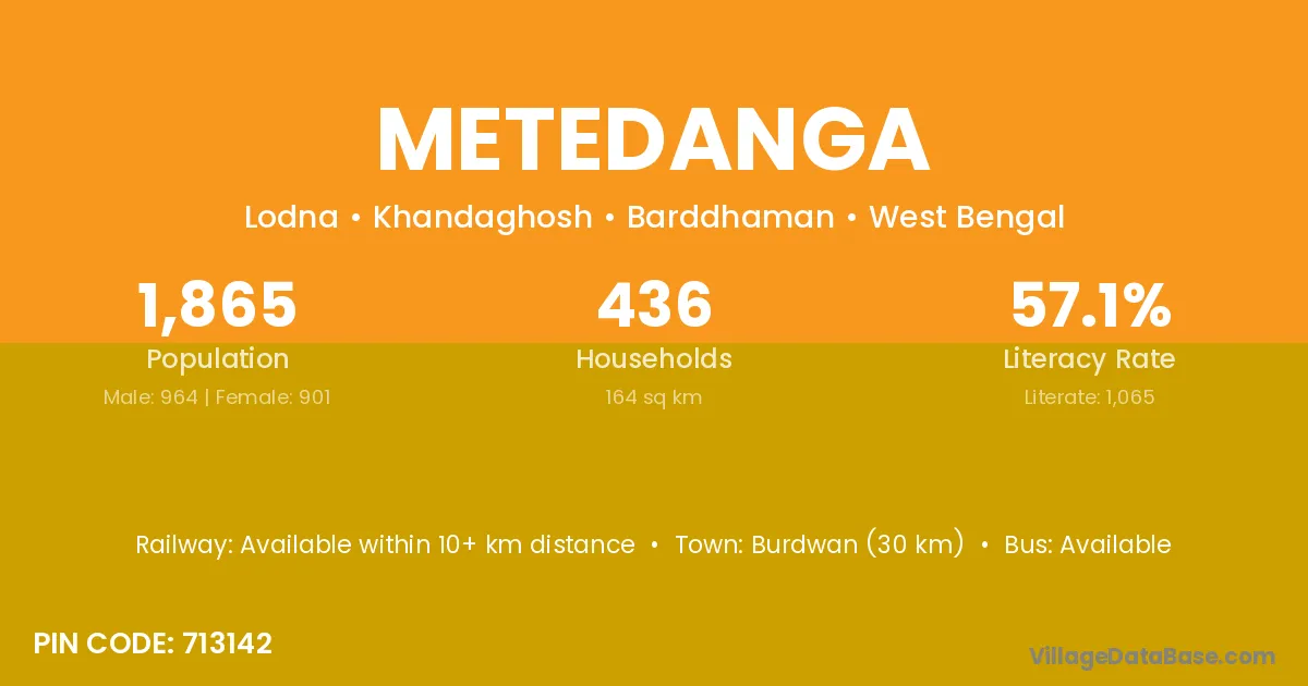 Burdwan (30 km) is the nearest town to Metedanga village for major economic activities and is located approximately 30 km away.