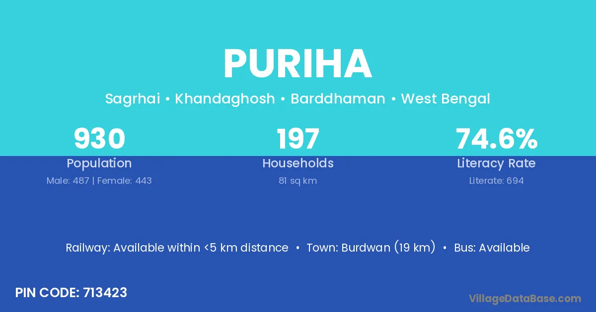 Burdwan (19 km) is the nearest town to Puriha village for major economic activities and is located approximately 19 km away.