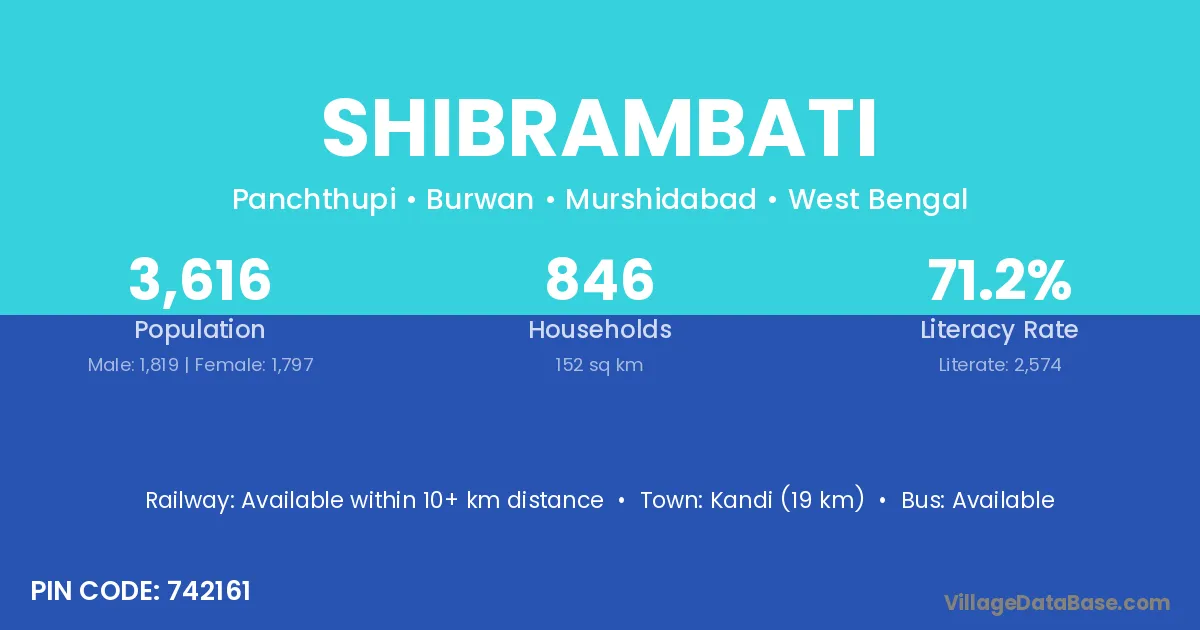 Burdwan (31 km) is the nearest town to Shibrambati village for major economic activities and is located approximately 31 km away.