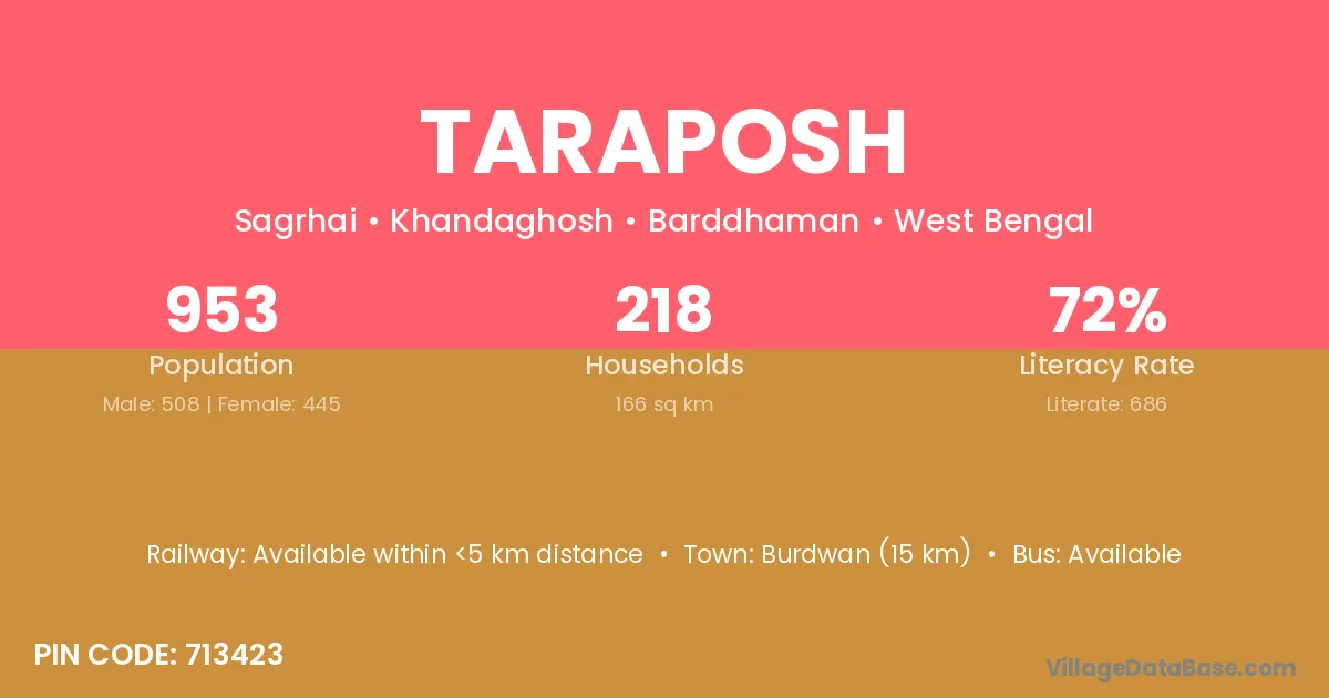 Burdwan (15 km) is the nearest town to Taraposh village for major economic activities and is located approximately 15 km away.