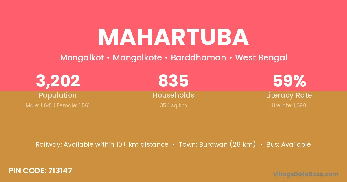 Burdwan (28 km) is the nearest town to Mahartuba village for major economic activities and is located approximately 28 km away.