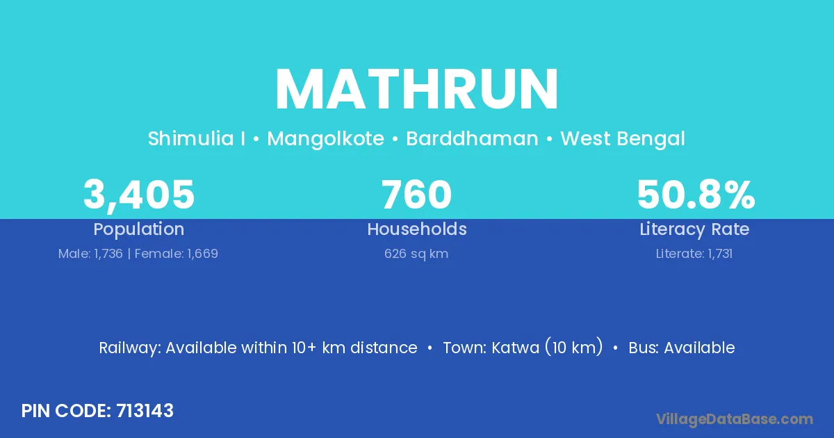 Katwa (10 km) is the nearest town to Mathrun village for major economic activities and is located approximately 10 km away.