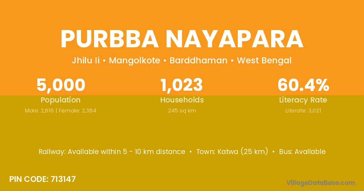 Katwa (25 km) is the nearest town to Purbba Nayapara village for major economic activities and is located approximately 25 km away.