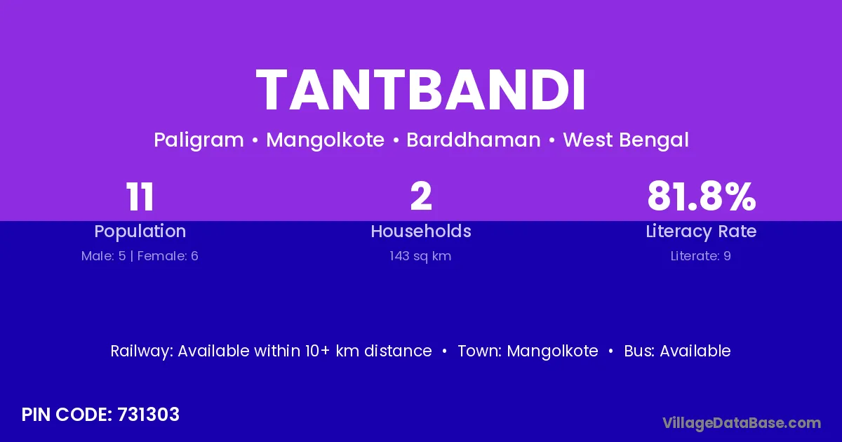Tantbandi village has a total population of 11 people, of which 5 are males and 6 are females.