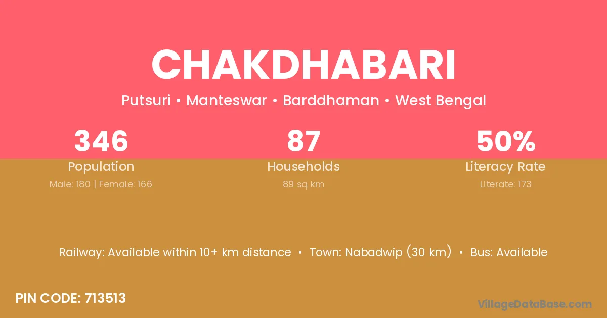 Nabadwip (30 km) is the nearest town to Chakdhabari village for major economic activities and is located approximately 30 km away.