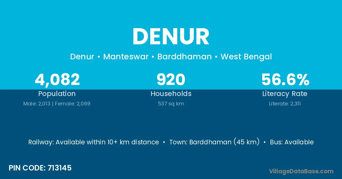 Barddhaman (45 km) is the nearest town to Denur village for major economic activities and is located approximately 45 km away.