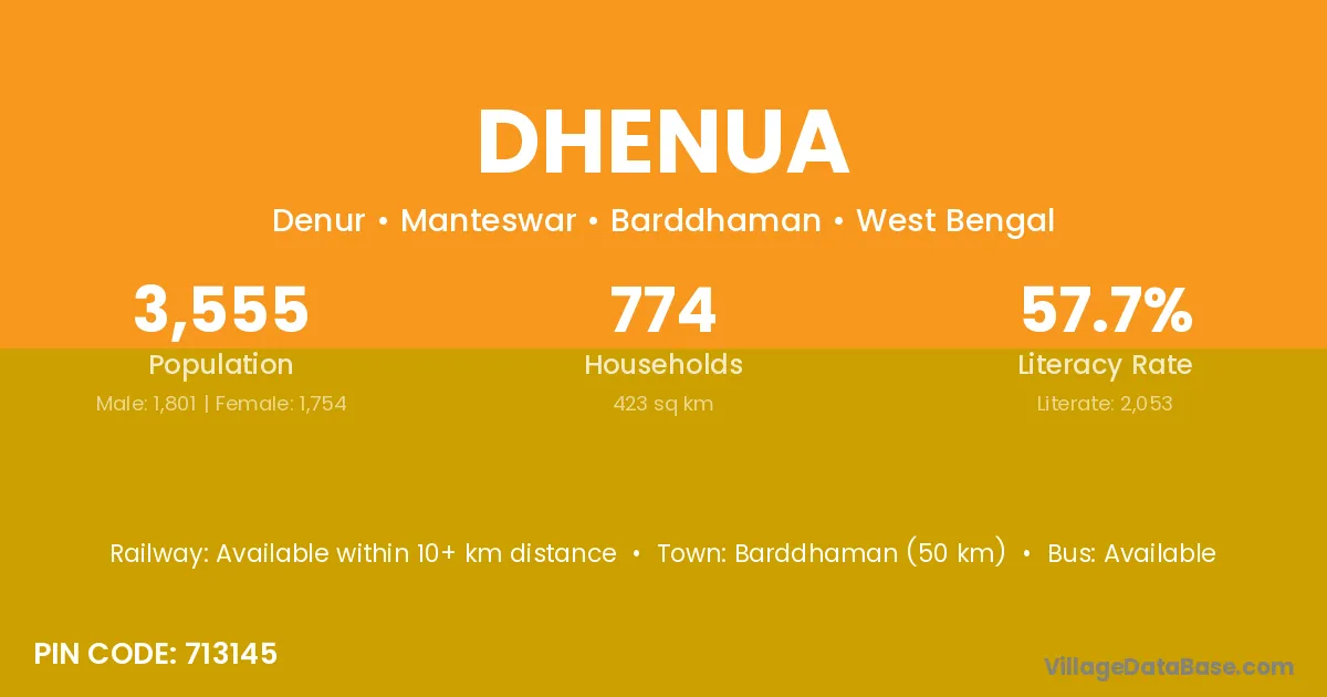 Barddhaman (50 km) is the nearest town to Dhenua village for major economic activities and is located approximately 50 km away.