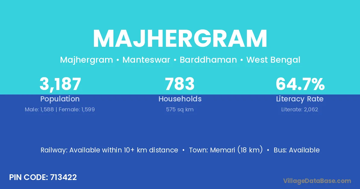 Memari (18 km) is the nearest town to Majhergram village for major economic activities and is located approximately 18 km away.