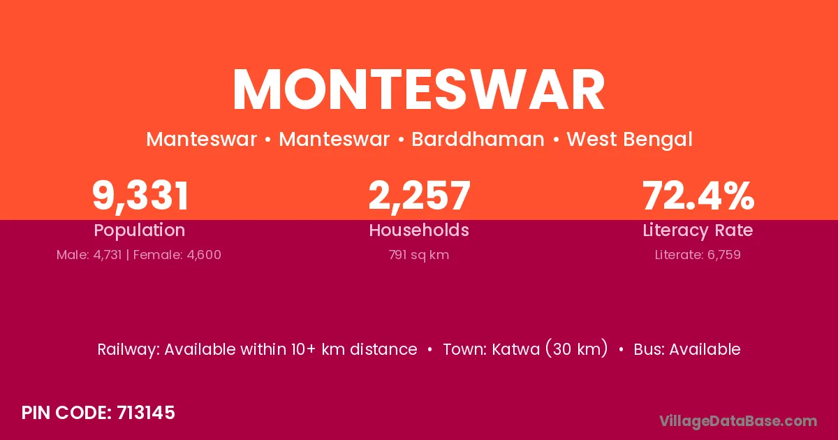 Katwa (30 km) is the nearest town to Monteswar village for major economic activities and is located approximately 30 km away.