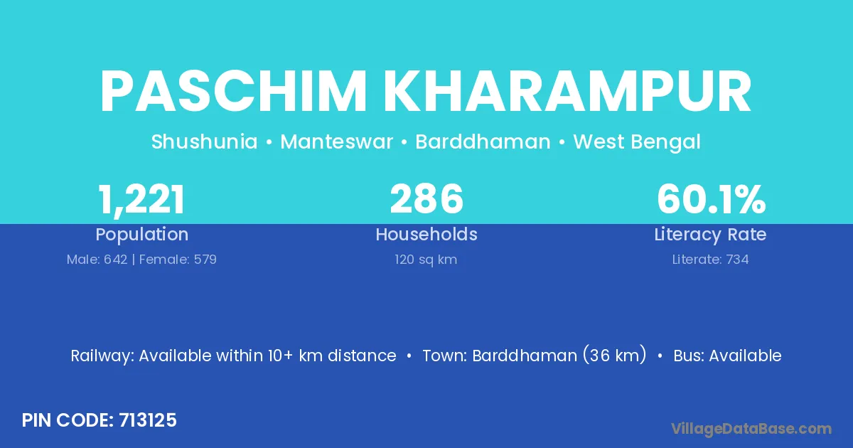 Barddhaman (36 km) is the nearest town to Paschim Kharampur village for major economic activities and is located approximately 36 km away.