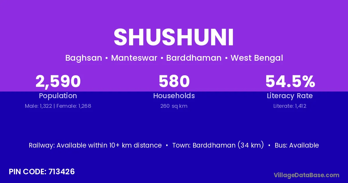 Barddhaman (34 km) is the nearest town to Shushuni village for major economic activities and is located approximately 34 km away.
