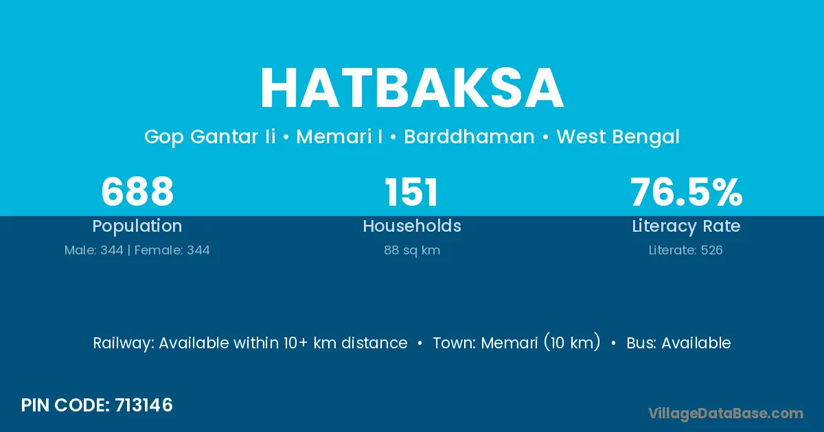 Memari (10 km) is the nearest town to Hatbaksa village for major economic activities and is located approximately 10 km away.