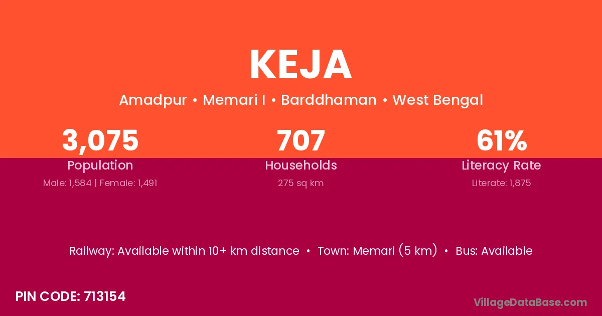 The literacy rate of Keja village is 60.98%. Male literacy stands at 66.60% and female literacy at 55.00%.