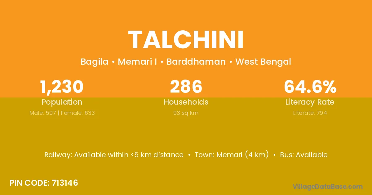 Memari (4 km) is the nearest town to Talchini village for major economic activities and is located approximately 4 km away.