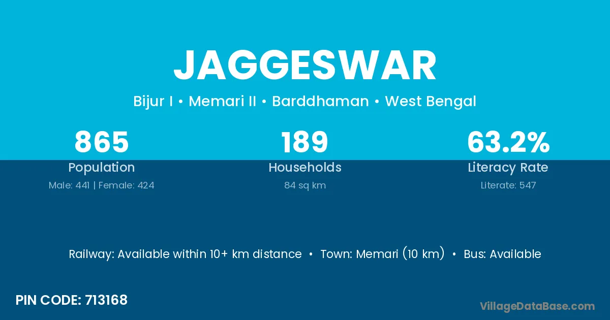 Memari (10 km) is the nearest town to Jaggeswar village for major economic activities and is located approximately 10 km away.