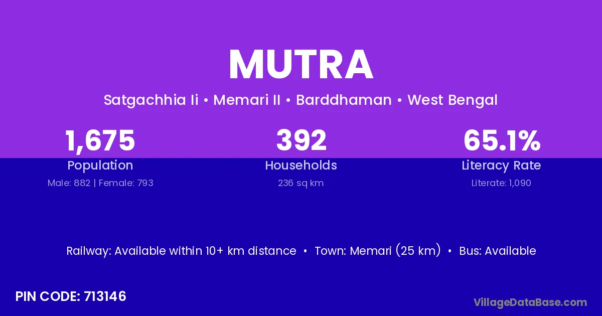 Memari (25 km) is the nearest town to Mutra village for major economic activities and is located approximately 25 km away.