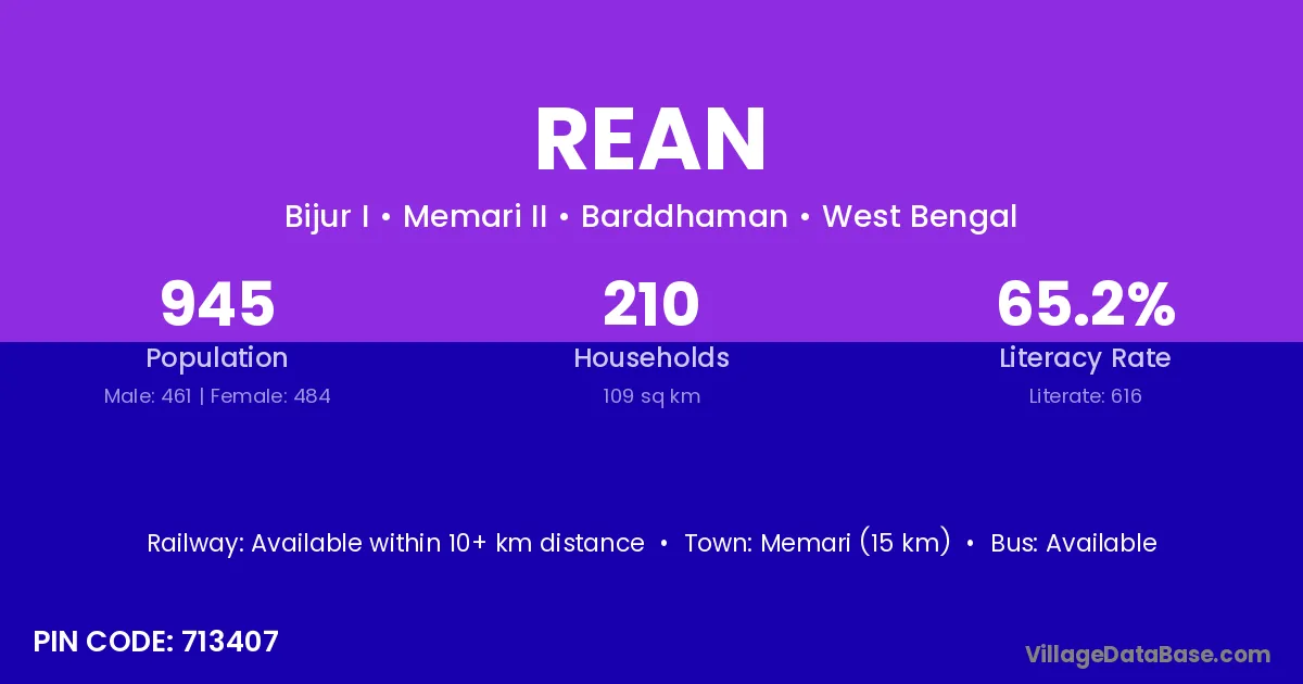 Memari (15 km) is the nearest town to Rean village for major economic activities and is located approximately 15 km away.
