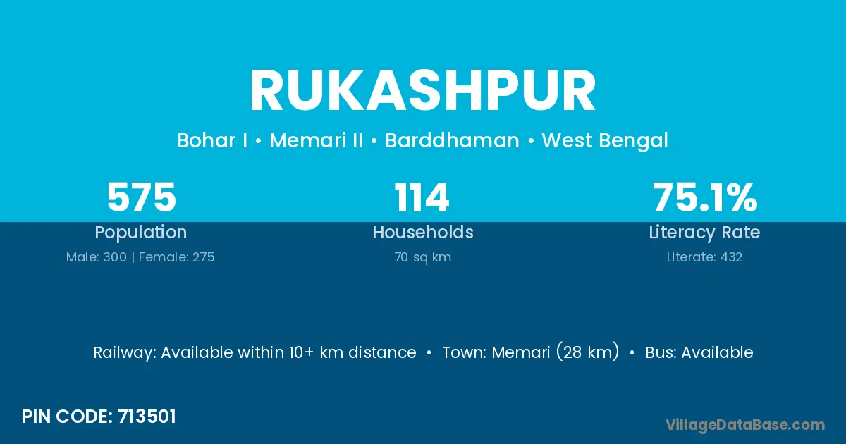 Memari (28 km) is the nearest town to Rukashpur village for major economic activities and is located approximately 28 km away.