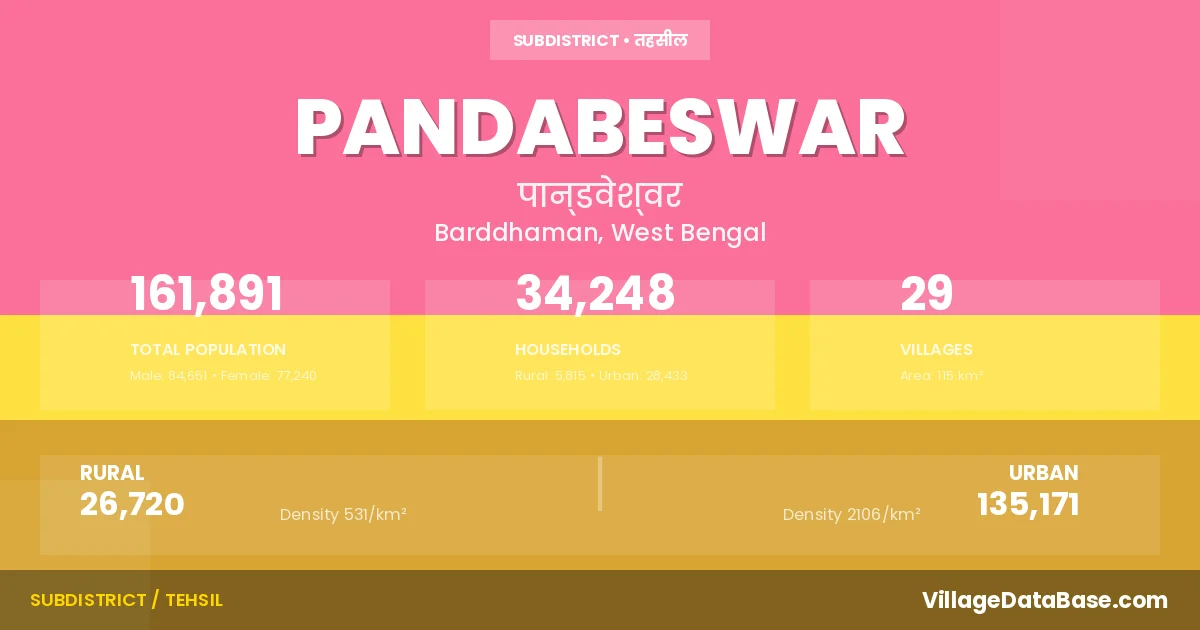 According to the 2011 census The total area of Pandabeswar Subdivision is 115 km², with a population of 161891 people. The population density is 1,413 inhabitants per square kilometre, and there are approximately 34248 houses in the sub district.