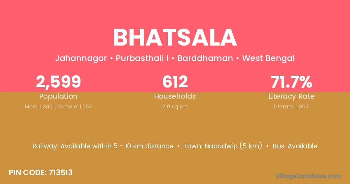 Nabadwip (5 km) is the nearest town to Bhatsala village for major economic activities and is located approximately 5 km away.